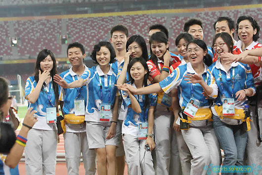 Volunteers pose at the National Stadium September 17, 2008.[sohu.com]