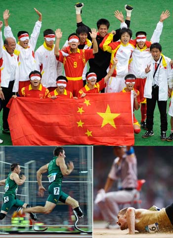 (Upper) Members of China's women team pose for a group photo after defeating Spain in a preliminary match of the Football 5-a-side event Sept. 13, 2008.(Lower Left) Oscar Pistorius of South Africa (L) competes in the Men's 200m T44 final of the Beijing Paralympic Athletics event Sept. 13, 2008.(Lower Right) Wojtek Czyz of Germany competes in the Men's Long Jump F42/44 final of the Beijing Paralympic Athletics event Sept. 16, 2008. [Xinhua]