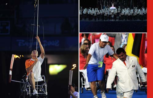 (Left) Wheelchair-bound Hou Bin of China climbs up a rope to ignite the flame during the opening ceremony of the Beijing Paralympic Games Sept. 6, 2008.(Upper Right) 11-year-old Li Yue, a girl who lost her right leg in the Sichuan earthquake, performs with other 109 disabled dancers during the opening ceremony of the Beijing Paralympic Games Sept. 6, 2008.(Lower Right) A member of the Mexican delegation moved on his knees into the Bird's Nest during the opening ceremony of the Beijing Paralympic Games Sept. 6, 2008. [Xinhua]