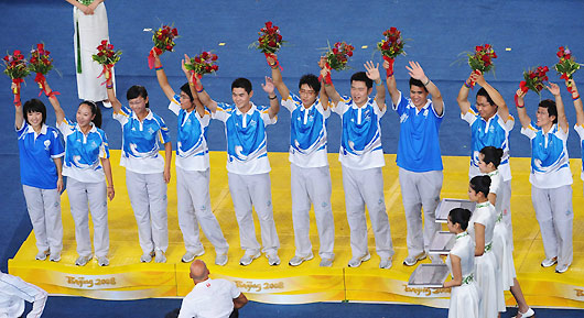 Five newly-elected members of the Athletes' Council of the International Paralympic Committee (IPC) present bouquets to 12 volunteers of the Beijing 2008 Paralympics at the Games' closing ceremony September 17, 2008. The 12 represented some 44,000 volunteers working at the Games venues and more than 1.4 million others who helped the host city in security, transport, information and lodging services.[Xinhua]