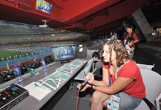 A reporter with BBC live broadcasts atthe closing ceremony of the Beijing Paralympic Games in the National Stadium, better known as the "Bird's Nest", in Beijing on September 17, 2008. [Xinhua]