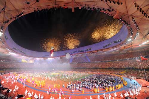 Fireworks are displayed in the sky during the Beijing 2008 Paralympic Games closing ceremony held in the National Stadium, or the Bird's Nest, Beijing, capital of China, Sept. 17, 2008. The closing ceremony kicked off at 8 pm sharp on Wednesday. [Xinhua]