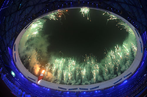 Fireworks are displayed in the sky during the Beijing 2008 Paralympic Games closing ceremony held in the National Stadium, or the Bird's Nest, Beijing, capital of China, Sept. 17, 2008. The closing ceremony kicked off at 8 pm sharp on Wednesday. [Xinhua]