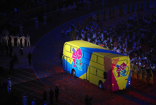 The London bus drives in the National Stadium, better known as the "Bird's Nest", in Beijing on September 17, 2008. [Xinhua]