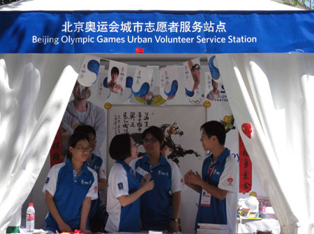 Volunteers talk with one another at a service station in Beijing during the 2008 Olympic Games. [Xinhua]