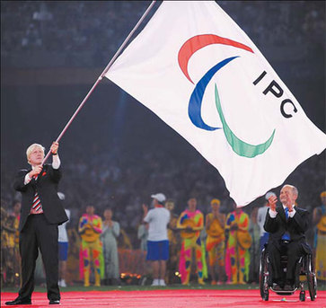 London Mayor Boris Johnson receives the Paralympic flag from International Paralympic Committee President Sir Philip Craven. The British capital hosts the next Games in 2012. [Xinhua]
