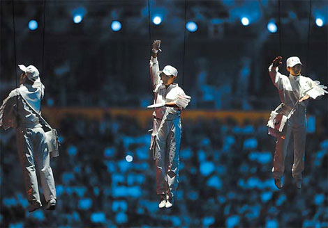 Postmen hanging 60m above the ground collect and deliver the letters dedicated to the 2012 London Games during Wednesday's Closing Ceremony. [AFP]