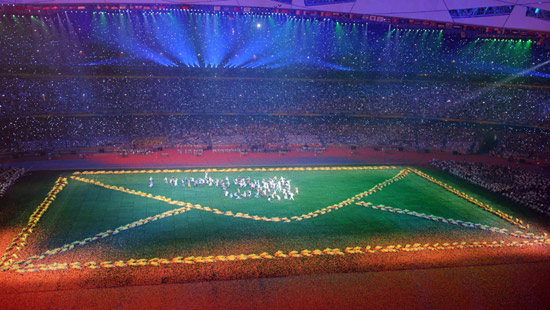 Beijing invites the world to join its tribute to a better future with a giant envelop formed by dancers at the Bird's Nest during Wednesday's Closing Ceremony. [Xinhua]