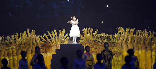 A girl "sings" in sign language at the paralympic Games closing ceremony at the Bird's Nest in Beijing, September 17, 2008. [Xinhua]