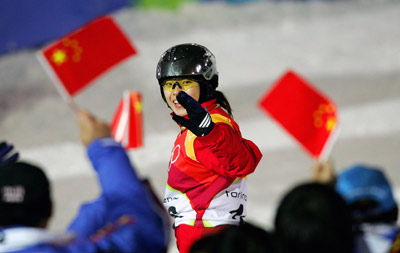 China's Wang Jiao celebrates during qualification in the women's aerials