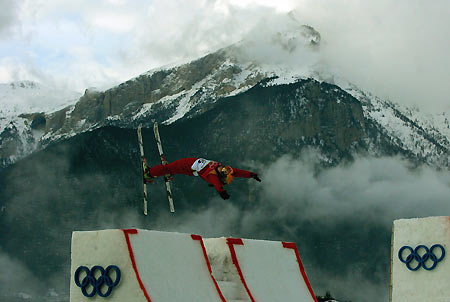 China's Xu Nannan trains during the women's aerials freestyle competition at the Torino 2006 Winter Olympic Games in Sauze, Italy, February 21, 2006. [Reuters]