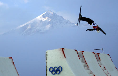 Oleksandr Abramenko of Ukraine trains during the men's aerials freestyle competition at the Torino 2006 Winter Olympic Games in Sauze, Italy, February 20, 2006. [Reuters]