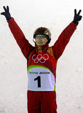 Li of China celebrates during the final of the women's aerials freestyle competition at the Torino 2006 Winter Olympic Games. Li Nina won a silver medal. [Reuters]