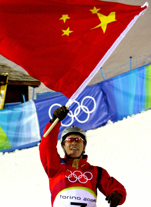 Han Xiaopeng of China celebrates the gold in the men's aerials freestyle competition at the Torino 2006 Winter Olympic Games in Sauze d'Oulx, Italy February 23, 2006. This is China's second gold at the ongoing event. [Reuters]