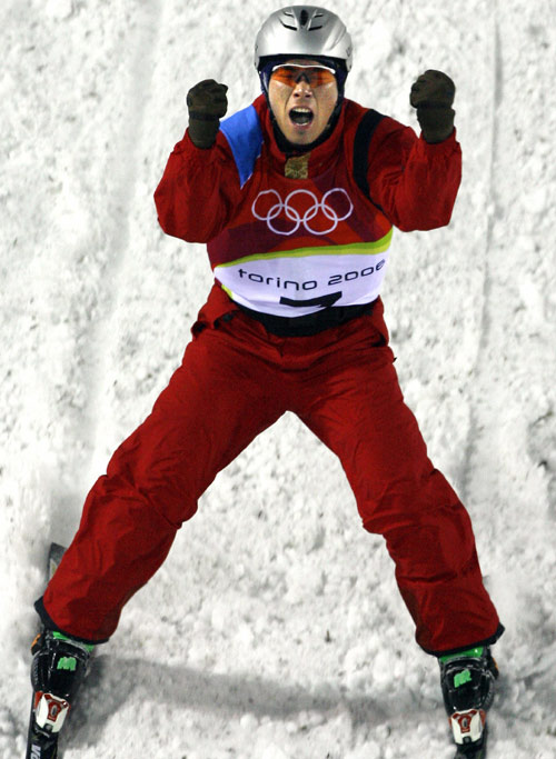 Han Xiaopeng of China celebrates the gold in the men's aerials freestyle competition at the Torino 2006 Winter Olympic Games in Sauze d'Oulx, Italy February 23, 2006. This is China's second gold at the ongoing event. [Reuters]