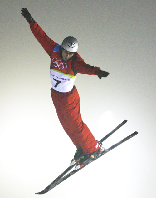 Han Xiaopeng of China jumps for the gold in the men's aerials freestyle competition at the Torino 2006 Winter Olympic Games in Sauze d'Oulx, Italy February 23, 2006. [Reuters]