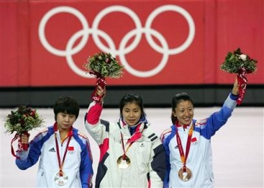 Silver medalist Wang Meng, of China, left, and bronze medalist Yang Yang, right, of China flank golf medalist South Korea's Jin Sun-yu after the womens' 1000 meter race in the Short Track Speed Skating competition at the Turin 2006 Winter Olympic Games in Turin, Italy, Saturday, Feb. 25, 2006. [AP]