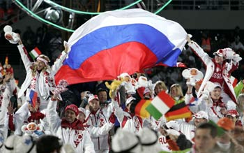 Russia's athletes carry a national flag during the closing ceremony at the Torino 2006 Winter Olympic Games in Turin, Italy, February 26, 2006. [REUTERS]