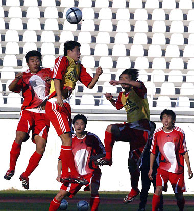 Players of China's national soccer team jump for a header during a training session in Ain, UAE before an AFC Asian Cup qualifier tie against Iraq on March 1, 2006 [Xinhua]