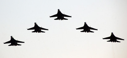 fighters, flies in formation near an airport in Zhangjiajie, central China's