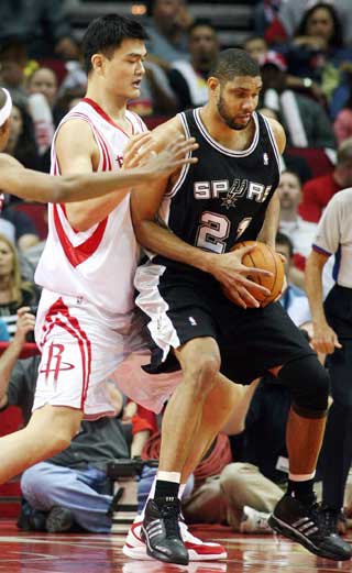Houston Rockets center Yao Ming (L) guards San Antonio Spurs center Tim Duncan (R) during the first half of their NBA game in Houston, Texas, March 18, 2006. [Reuters]