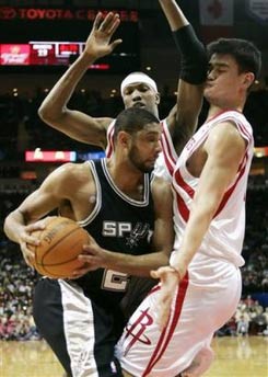San Antonio Spurs' Tim Duncan (21) is trapped by Houston Rockets'