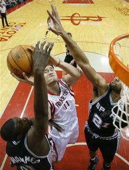 Houston Rockets' Yao Ming (11), of China, is fouled by San Antonio Spurs'