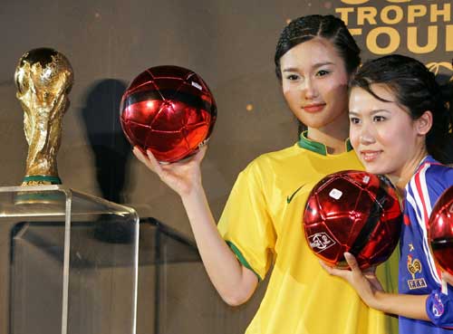 Chinese models pose next to the FIFA World Cup trophy on display in Beijing March 14, 2006. The trophy is on its inaugural journey to 31 cities in 29 countries ahead of the 2006 World Cup which begins June 9 in Germany. [Reuters]