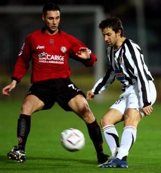 Juventus' Alessandro Del Piero (R) challenges Livorno's Marc Pfertzel during their Italian Serie A soccer match at the Armando Picchi Stadium in Livorno March 18, 2006. [Reuters]