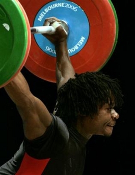 Swaziland's Linda Matsebula strains to hold weights during the 2006 Commonwealth Games men's weightlifting 77 kg category in Melborne, Australia, Sunday, March 19, 2006. [AP]