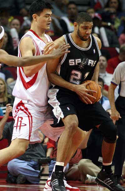 Houston Rockets center Yao Ming (L) guards San Antonio Spurs center Tim Duncan (R) during the first half of their NBA game in Houston, Texas, March 18, 2006. [Reuters]
