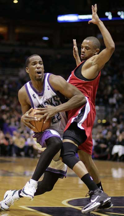 Milwaukee Bucks guard Michael Redd (L) is fouled by Portland Trail Blazers