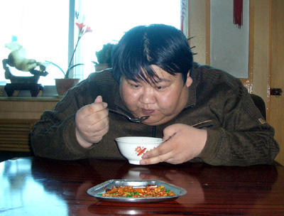 Zhang Feng, 37, who weighs 200 kg (441 lbs), eats in Fugu County, northwest China's Shaanxi province, March 22, 2006. Due to obesity, Zhang has difficulty in dealing with daily chores. According to doctors, if not effectively controlled, the excessive weight may pose a threat to his life. [Newsphoto]