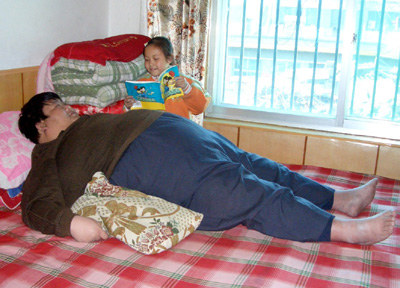 Zhang Feng, 37, who weighs 200 kg (441 lbs), lies on a bed with his daughter reading beside him in Fugu County, northwest China's Shaanxi province, March 22, 2006. Due to obesity, Zhang has difficulty in dealing with daily chores. According to doctors, if not effectively controlled, the excessive weight may pose a threat to his life.[Newsphoto]
