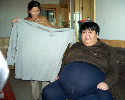 Zhang Feng, 37, who weighs 200 kg (441 lbs), sits on a sofa with his wife holding his big-size clothes in Fugu County, northwest China's Shaanxi province, March 22,2006. Picture taken March 22, 2006. Due to obesity, Zhang has difficulty in dealing with daily chores. According to doctors, if not effectively controlled, the excessive weight may pose a threat to his life.[Newsphoto]