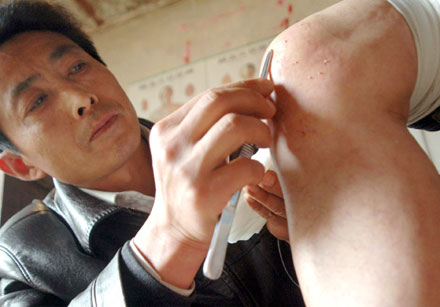 nipper after a session of bee venom treatment of arthritis at a clinic in