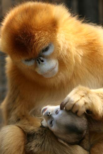 A golden monkey takes care of her one-month-old baby at a zoo in Jinan, East China's Shandong Province, April 5, 2006. [Newsphoto]