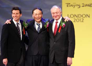 Beijing's Mayor Wang Qishan (C) and London counterpart Ken Livingstone (R)pose for a photo during the opening ceremony of the 'London Experience' exhibition in Beijing April 10, 2006. Two mayors have signed a 'sister city' agreement vowing to promote exchanges and cooperation after the ceremony. [newsphoto]