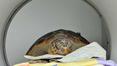 Fender, a 20-year-old marine Loggerhead turtle is seen during a CT scan at the Israeli Veterinary in Beit Dagan, near Tel Aviv, April 25, 2006. Fender is suffering from excessive air in the lungs. The turtle was caught by fishermen in the Mediterranean sea, off the coast of Israel six months ago. [Reuters]