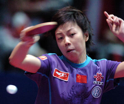 Zhang Yining of China returns a ball