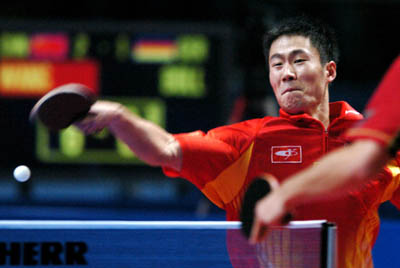 China's Wang Liqin returns a ball during his semi-final match at the 48th World Cup Table Tennis Championships in Bremen, Germany April 30, 2006. China beat Germany 3-1.[Xinhua]