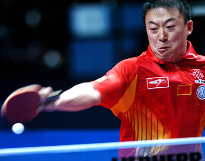 China's Ma Lin returns a ball to Timo Boll of Germany during