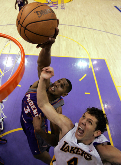 Phoenix Suns Boris Diaw of France (L) puts up a shot past Los Angeles Lakers
