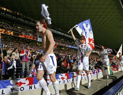 Olympique Lyon's players celebrate their fifth French Ligue 1 title running after their match against Saint-Etienne at the Gerland stadium in Lyon April 30, 2006. [Reuters]