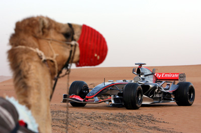 A camel sits near a McLaren Formula One car put on display for visitors in al Maha desert resort, 100 km (62 miles) south of Dubai, United Arab Emirates, May 1, 2006. [Reuters]