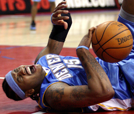 Denver Nuggets Carmelo Anthony reacts as he falls to the floor after being