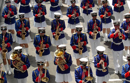 performing patriotic music on parade.[Xinhua]