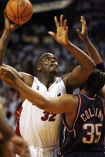 Miami Heat center Shaquille O'Neal (L) shoots over New Jersey Nets center