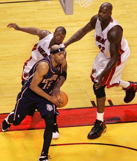 Miami Heat Dwyane Wade (L) tries to stop New Jersey Nets Vince Carter (15) as