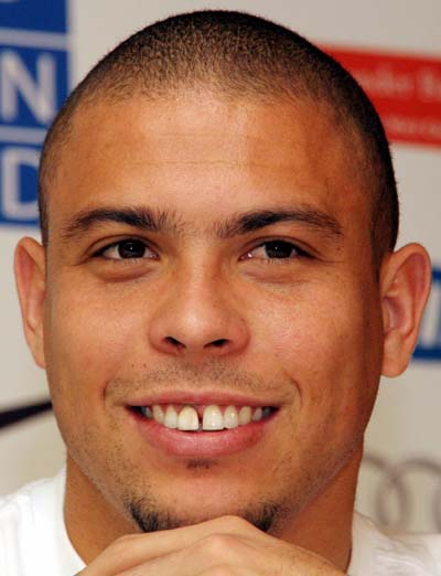 Real Madrid's Brazilian soccer player Ronaldo smiles during the presentation of his official website www.worldofronaldo.com in Madrid May 10, 2006.[Reuters]